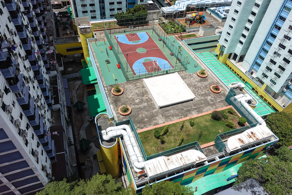 8. В центре микрорайонов часто находится невысокое здание с фуд-кортами и прочими общими помещениями. Такое довольно часто встречается в Азии - например, мы видели похожее возле Гонконгского здания-монстра. В данном случае на крыше этого строения находится небольшой скверик и баскетбольная площадка.
