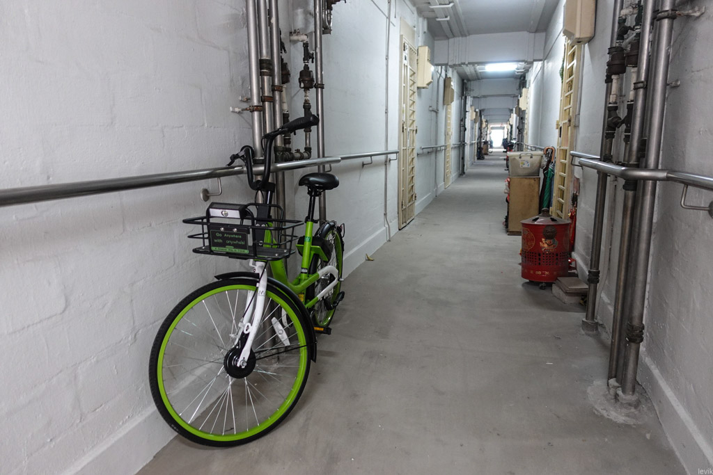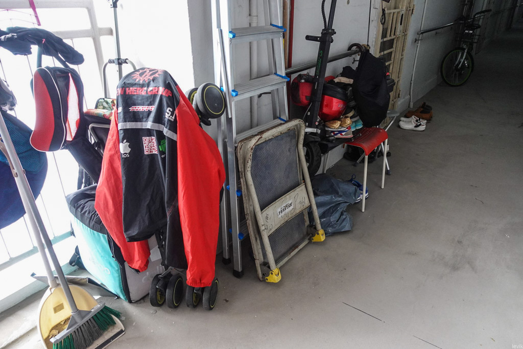 18. ...Вообще, чем ближе к концу коридора, тем меньше там народу проходит мимо, и тем смелее хозяева квартир оставляют свой хлам в общем, казалось бы, пространстве. Тут вам и коляска, и стремянка, и швабра... И даже скутер! (Их, кстати, в Сингапуре недавно запретили.) Целое подсобное помещение, короче.