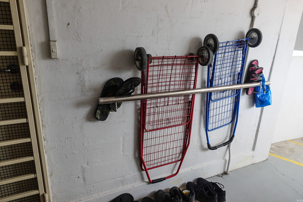16. Здесь перила используют как полочку для тележек и тапочек. Ещё много обуви стоит на полу.