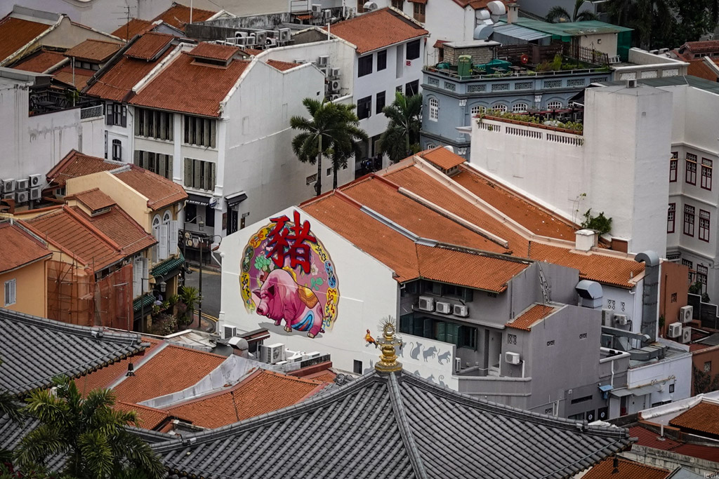 25. На торце одного из домов нарисован великолепный хряк - пережиток прошлого года (2019 был годом свиньи). В Сингапуре много китайцев, а уж в Чайнатауне - подавно, и здесь к таким вещам довольно серьёзно подходят.
