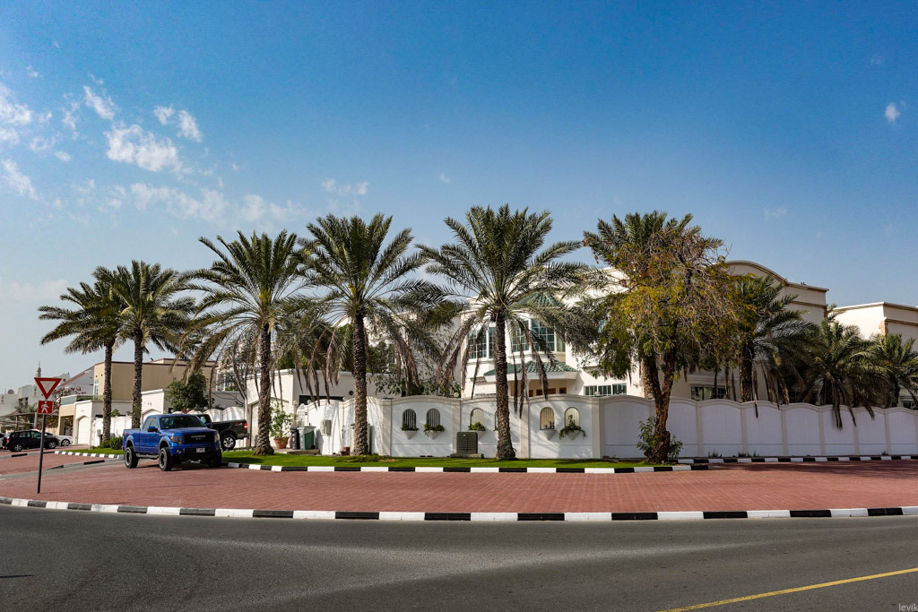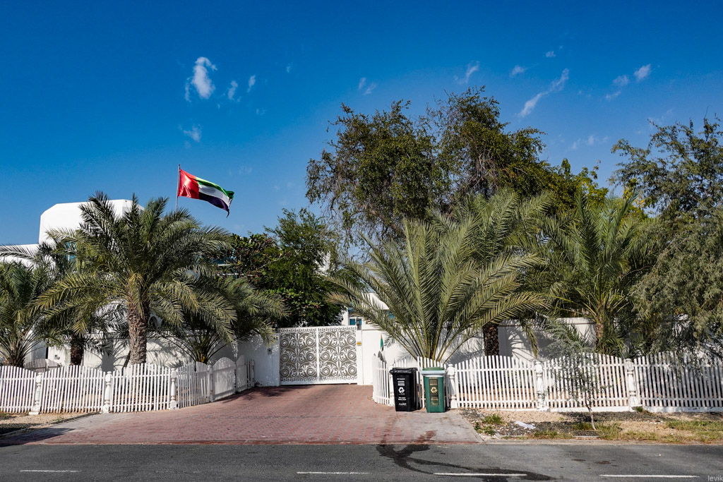 26. Над многими виллами развеваются флаги. Чаще всего это красно-зелёно-бело-чёрное знамя Объединённых Арабских Эмиратов. Не уверен, что это - проявление патриотизма, или знак, что там за забором и рощей пальмовых деревьев живёт какой-нибудь важный государственный муж. Может, сам вице-президент страны? (Конечно, вряд ли!)