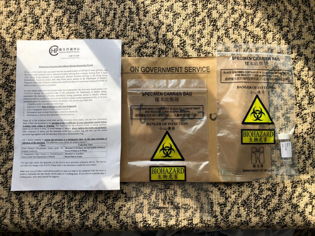 24. Кроме того, на 12й день карантина, приезжий должен сдать повторный анализ. Для этого выдаётся специальная баночка, которую родственники отбывающего карантин должны доставить в одну из клиник на территории Гонконга. Если же у него нет в Гонконге родственников (именно в такой ситуации мой друг), то он может вызвать службу доставки, которая отвезёт баночку с анализом куда надо за сто гонконгских долларов (около $13).