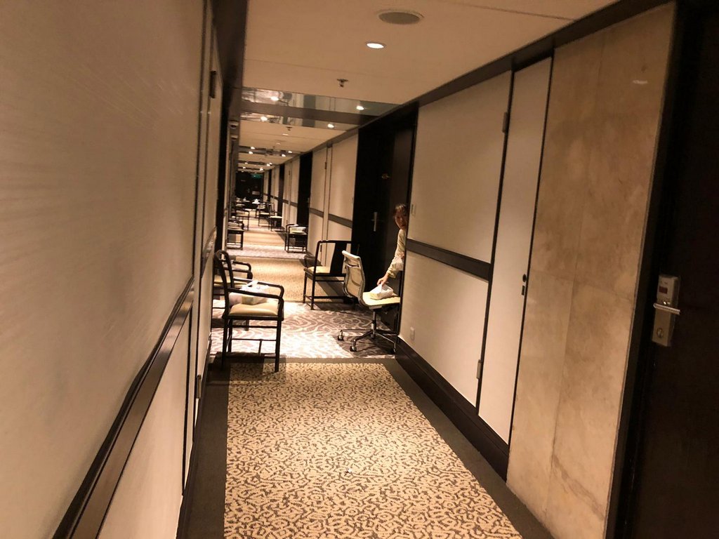 18. В коридоры гостиницы администрация выставила стулья из комнат. На них персонал кладёт кульки с ужинами и завтраками для "постояльцев", чтоб избежать личного контакта.