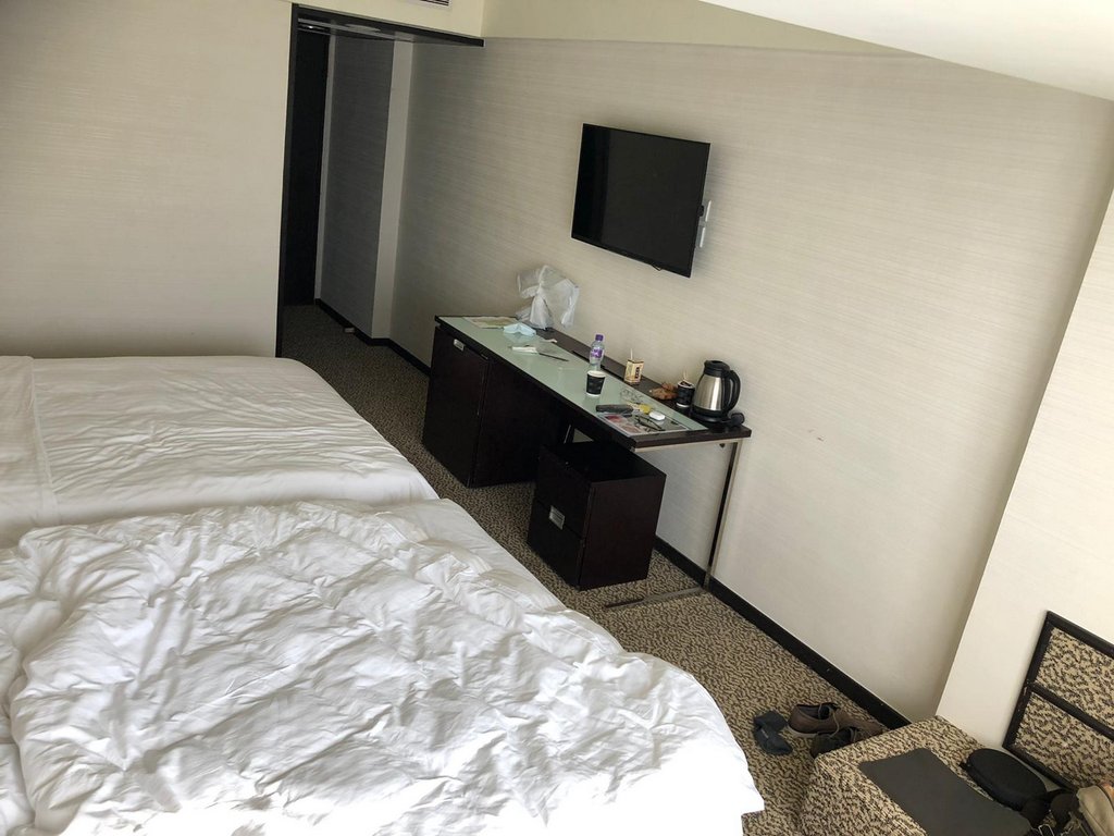 19. Вот номер моего товарища. Тут две двуспальные кровати, хотя он здесь ночует один. В сопровождающей литературе его просят не покидать комнату, не приглашать никого внутрь, а также не использовать это помещение в "нелегальных и аморальных целях". Чтоб не создавать для приезжих лишних соблазнов, в номере отключен телевизор.