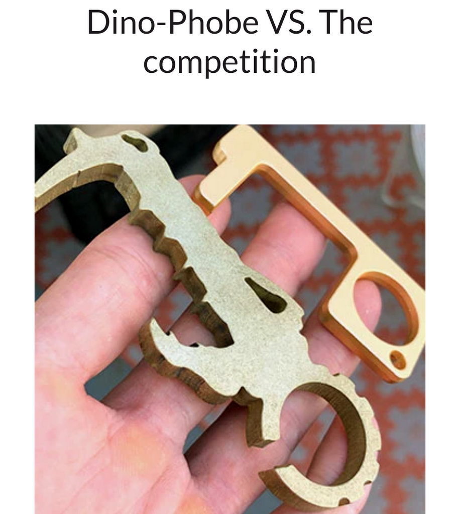 7. Главное преимущество этих медных пальцев в том, что медь и латунь якобы имеют натуральные анти-микробные свойства, и зараза на них долго не выживает. Правда, про вирусы в рекламах ничего не говорят. Покупателям предлагают нацепить эту штуку на брелок с ключами ("она с лёгкостью поместится в любой карман!"), и всегда иметь под рукой.