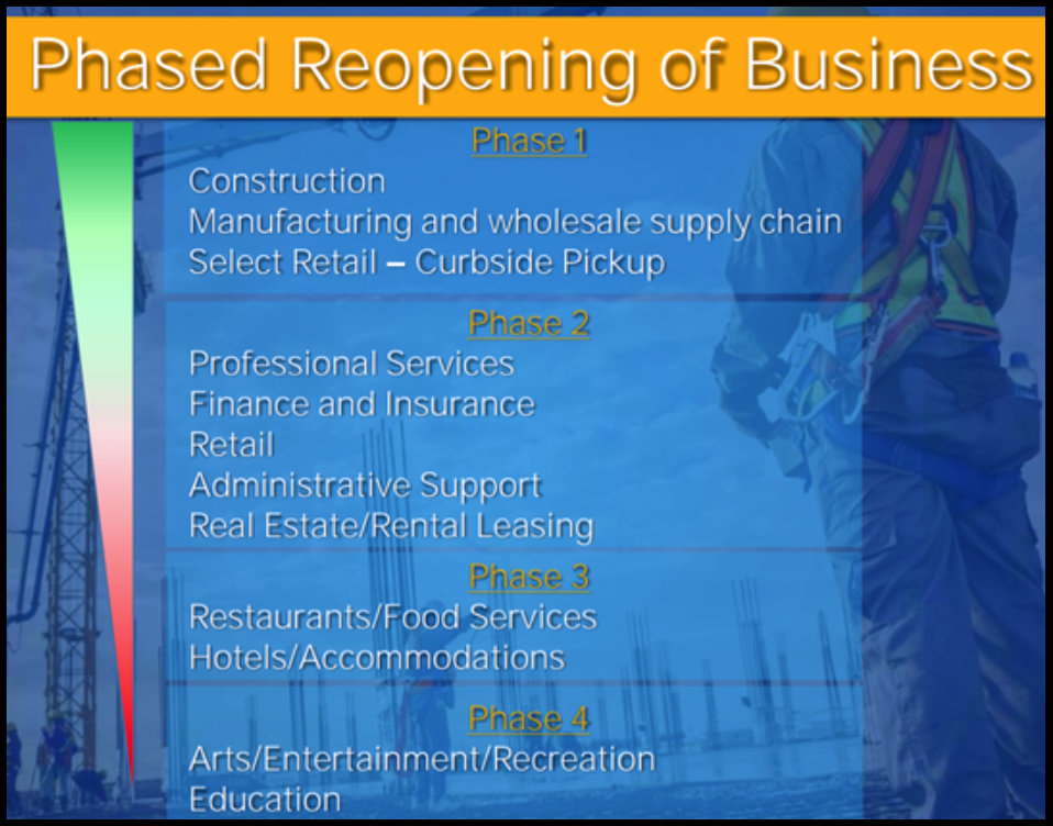 Поэтому губернатор объявил пошаговый план того, как именно будут снимать ограничения на различные роды деятельности, и как будут отслеживать, что это делается безопасно.