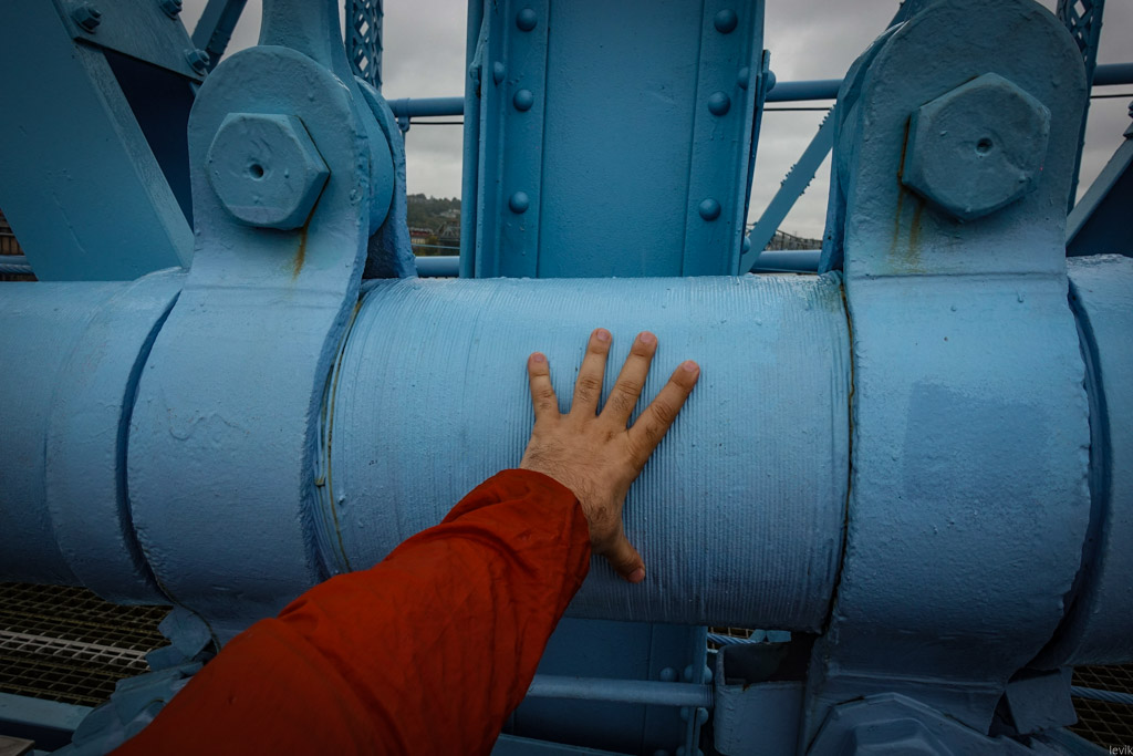 16. Как и в более позднем Бруклинском мосту, здесь мы видим запас прочности в виде гибридной системы тросов. Дорожное полотно не только подвешено с главных толстенных несущих с помощью вертикалей, но и закреплено к вершинам главных опор диагоналями. В результате получается красивая "паутина" переплетения тросов, ровно как и на мосту в Нью Йорке. Лично я нигде больше не видел подобной комбинации.