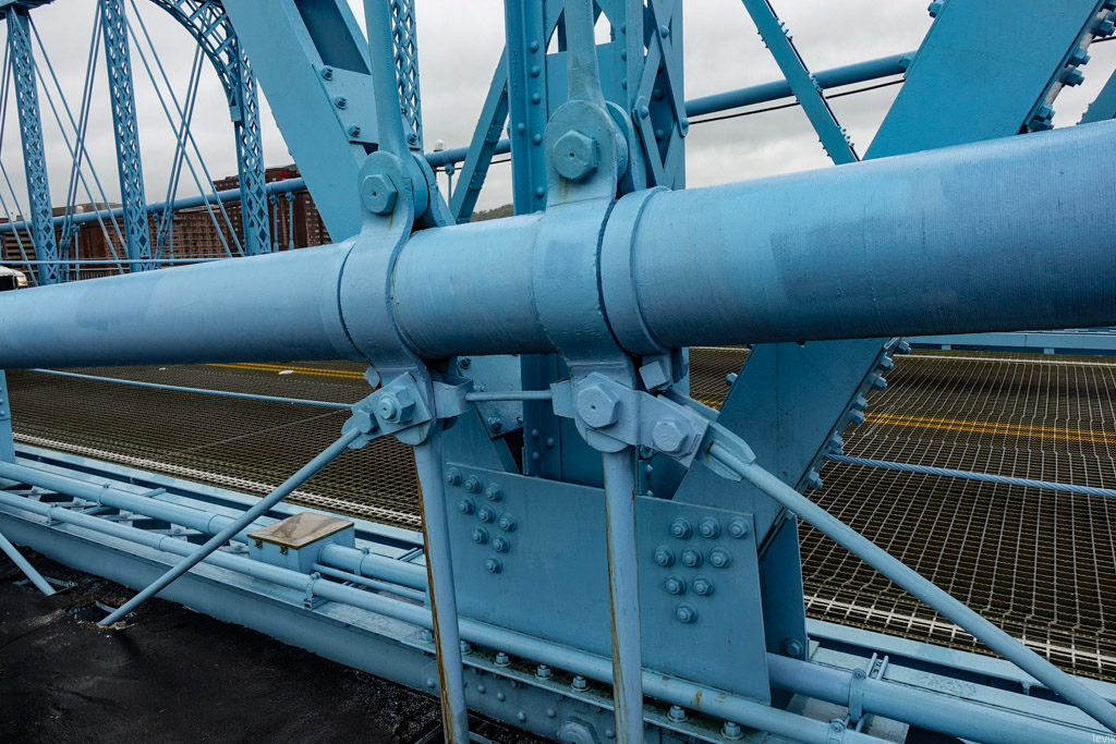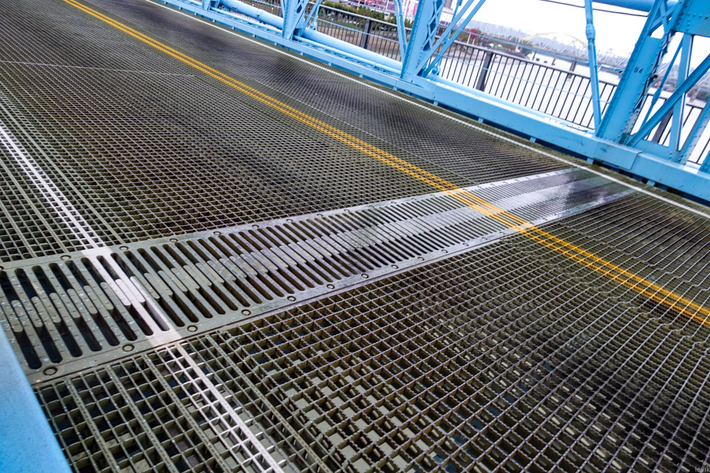 11. Чтоб облегчить конструкцию, она не заасфальтирована, а представляет собой металлическую решётку. В центре главного пролёта в дороге вот такие зубчики, позволяющие металлу расширяться и сжиматься с переменой сезонов. Было бы красиво, если бы граница между штатами Огайо и Кентукки проходила как раз по этим зубцам, но на самом деле это не так: на самом деле эта линия проходит прямо возле берега Цинциннати.