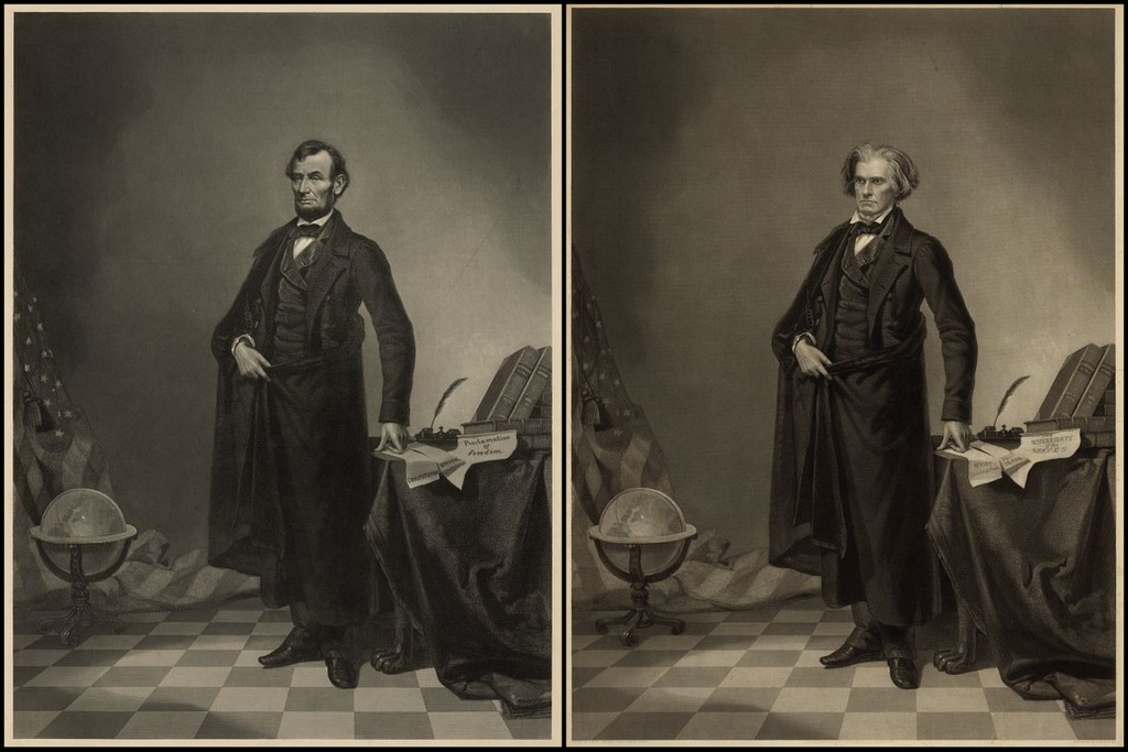 Любопытно ещё и то, что Хиксу пришлось перевернуть голову президента: на изначальной фотографии Брэди он смотрел вправо, туловище Кэлхуна развёрнуто влево. В результате такого преображения, знаменитая бородавка Линкольна перекочевала с его правой щеки на левую.