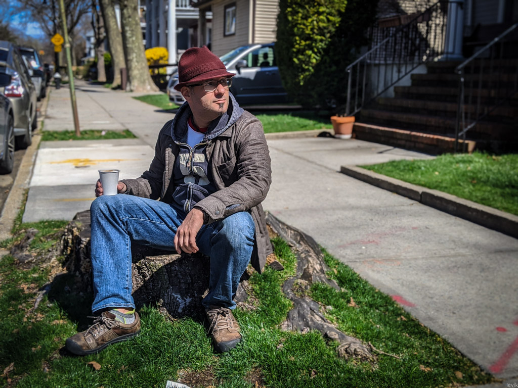 И вот, всё это время приходилось находить места, где в окрестности можно посидеть и выпить кофе, пока стакан не совсем ещё остыл. Я разведал все кофейни, которые продолжали работать; узнал, до какого часа они открыты; и выискал удобные места посидеть в радиусе пяти минут ходьбы. Вот, например место, которые мы с Тоней между собой прозвали "Кафе «Пенёк»":