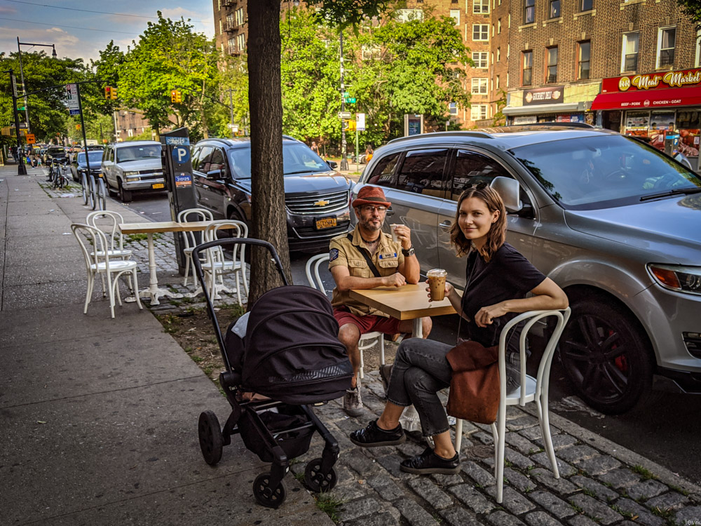 Понимаете в чём дело? Кафе в паре кварталов от моего дома выставило на тротуар летние столики! Теперь, когда берёшь кофе на вынос, можно присесть за соседний столик на улице, и на солнышке его выпить! Напомню вам, что раньше приходилось искать более необычные места, где пить "кофе с собой":