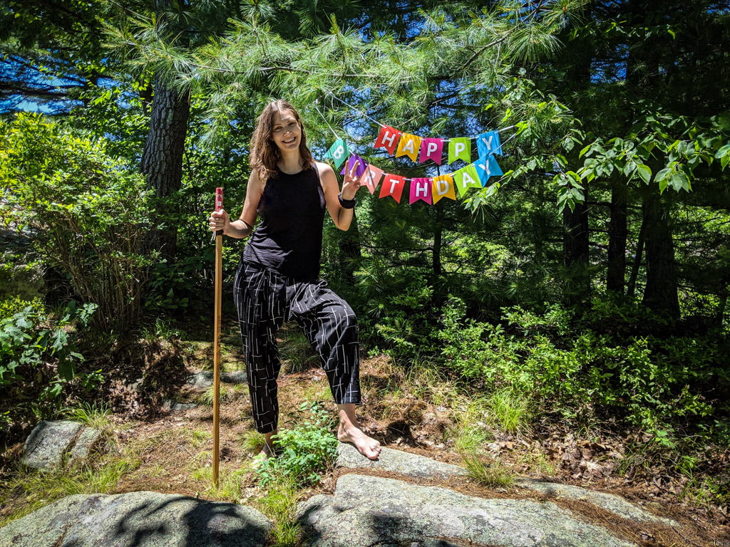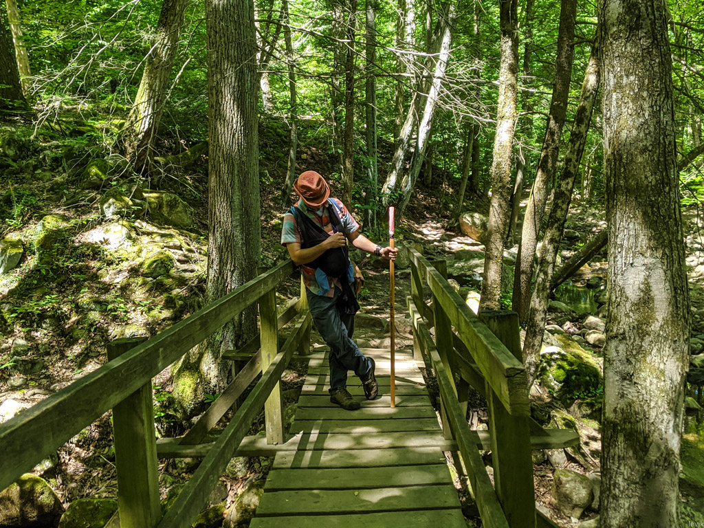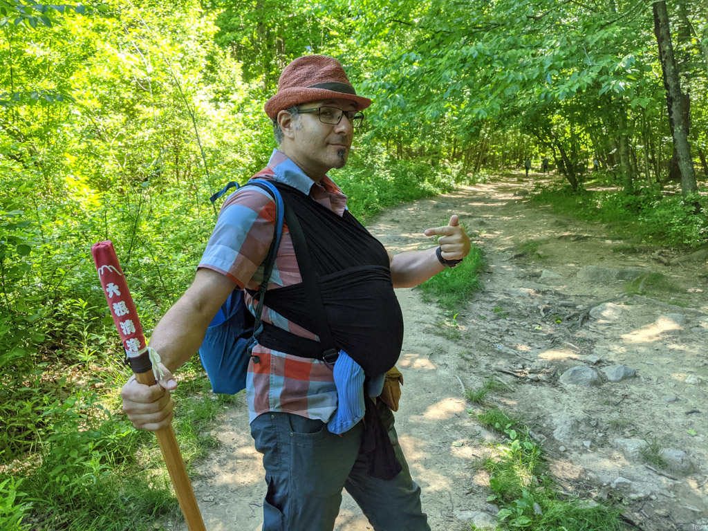 В этот небольшой поход (где-то по полтора часа в каждую сторону) мы взяли слинг, куда упаковали младенца. Так как на мне был ценный груз, надо было крепко стоять на ногах, поэтому я впервые за много лет взял сувенирный походный посох, приобретённый ещё в прошлой жизни в Японии.