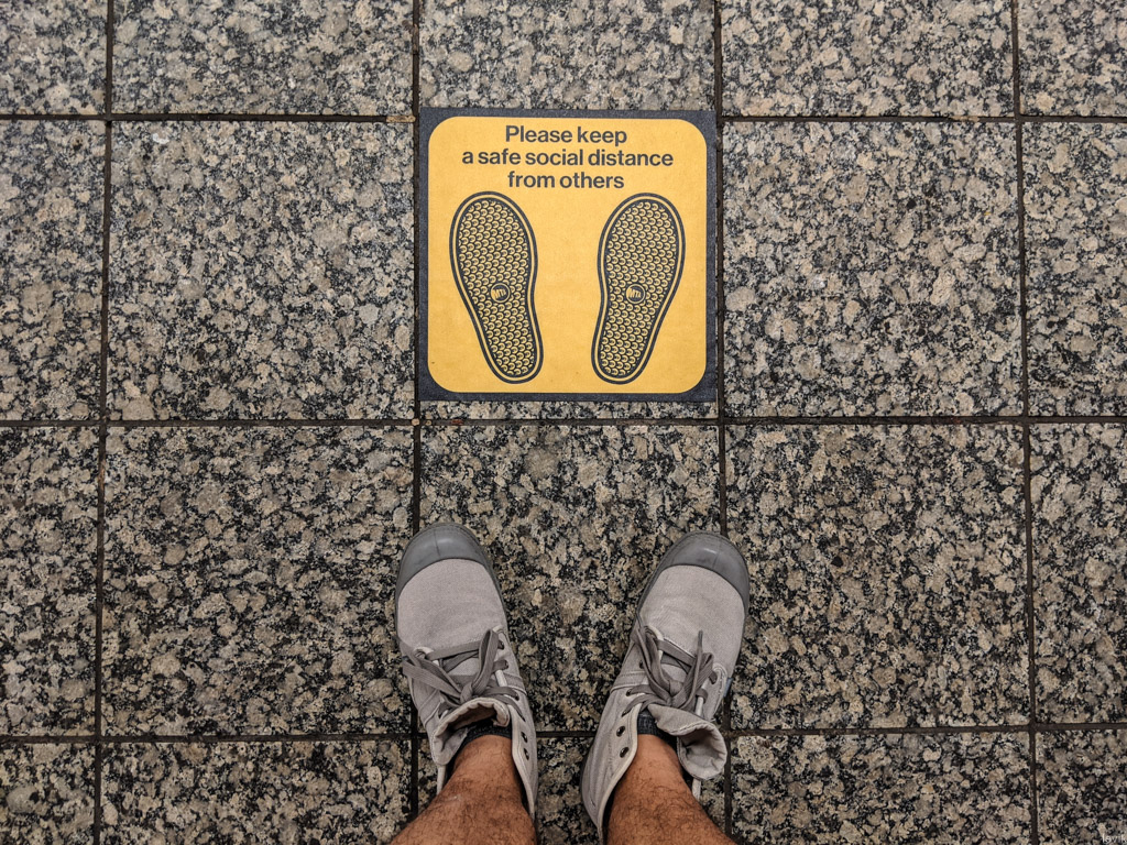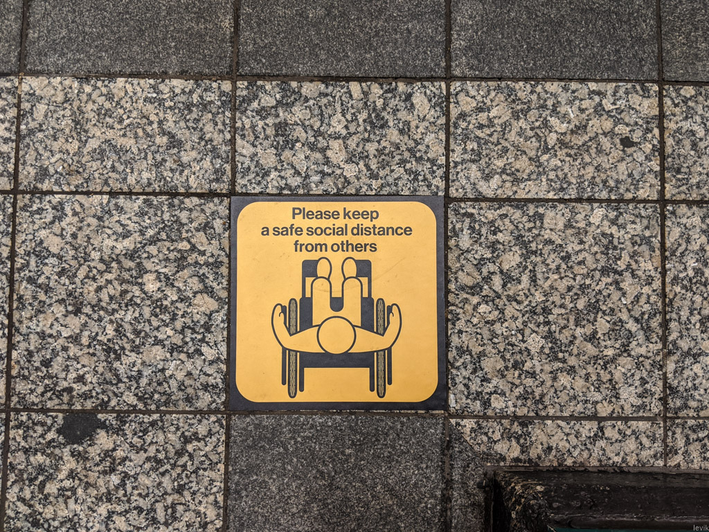 4. На перронах станций метро теперь появились таблички, указывающие, где стоит ждать поезд, чтоб находиться в двух метрах от других пассажиров. К сожалению, эти метки не соответствуют расположению дверей в вагонах, так что когда поезд приходит, все ожидающие всё равно стекаются к немногим входам в вагон.