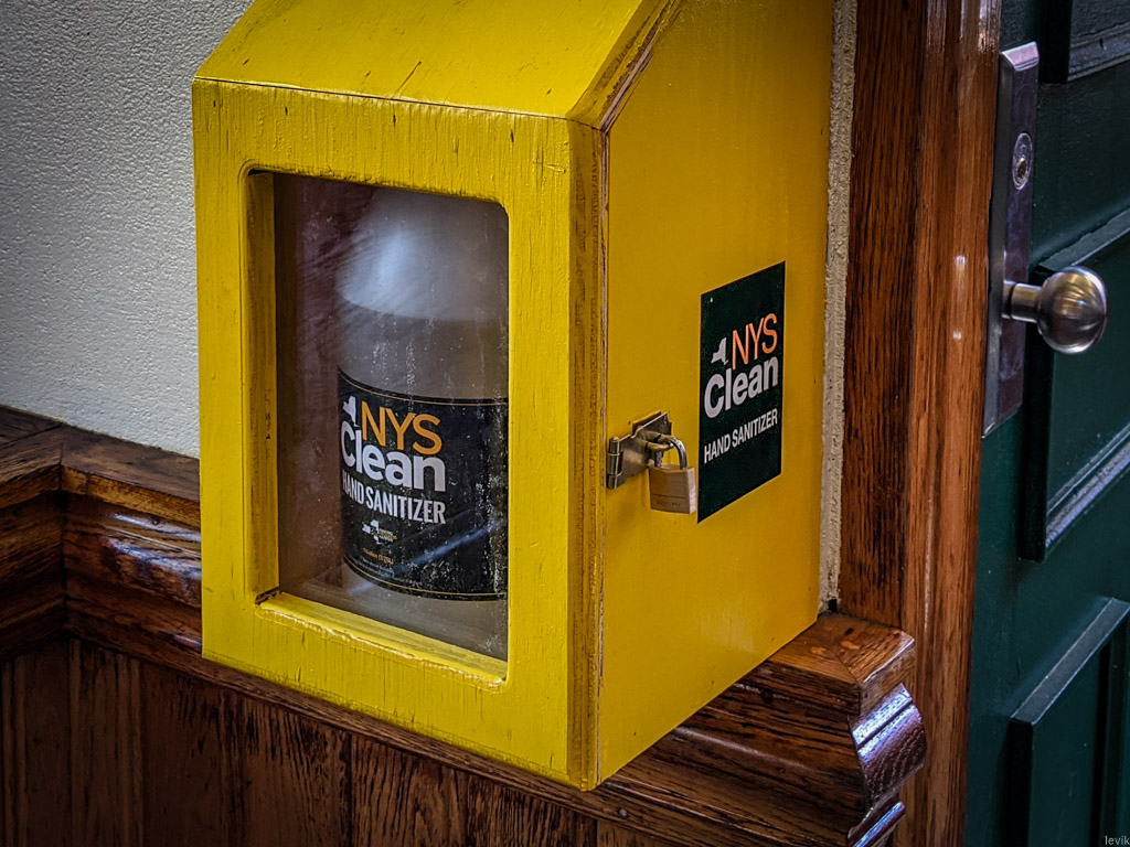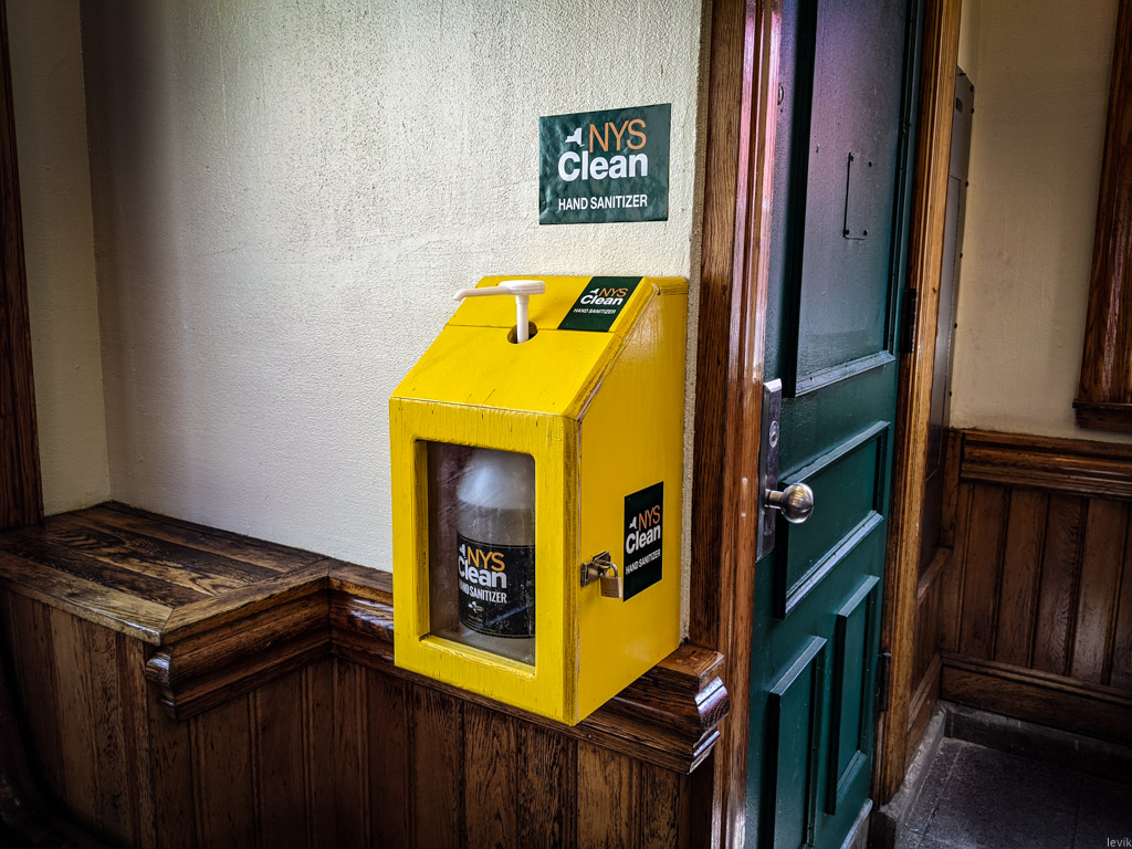 Это заявление удивило зрителей, которые не знали, что у властей штата существуют заводы или фабрики для производства таких продуктов. Но, как оказалось, этот проект был поручен компании Corcraft - красивое имя для ведомства, которое занимается производством используя в качестве рабочей силы заключённых штата Нью Йорк. То есть, эта компания принадлежит штату, и в её рамках заключённые разных тюрем производят всякую хозяйственную мелочь. И вот её мощности были направлены губернатором на производство этого дезинфицирующего средства с корявым названием "NYS Clean Sanitizer". Сейчас плоды трудов нью-йоркских заключённых красуются в огромных пластмассовых банках на станциях метро города. За замочком, разумеется: ведь несмотря на то, что дефицит на санитайзер давно остался позади, никогда не знаешь, кто захочет поживиться казёным средством...