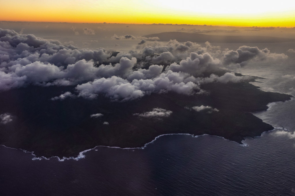 И вот она то и ловит всю влагу из проплывающих мимо облаков. А находящемуся за ней острову Кахоолаве остаётся совсем мало влаги, да и до той он не может дотянуться.