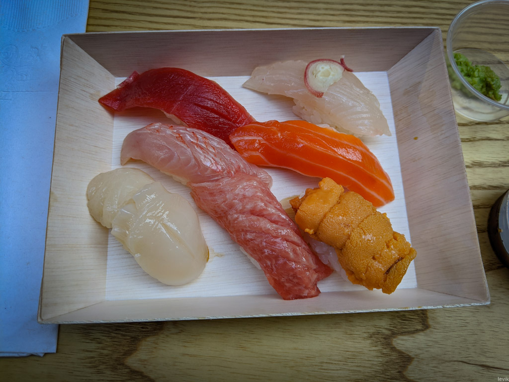 Суши оказались отменными. Вся посуда была одноразовой, но рыба и рис вышли невероятно вкусными. Может это просто я уже несколько месяцев хороших суши (сушей?) не ел, но это показалось мне чуть ли не лучше, чем когда мы ходили в суши-бар к подмастерью знаменитого Дзиро.