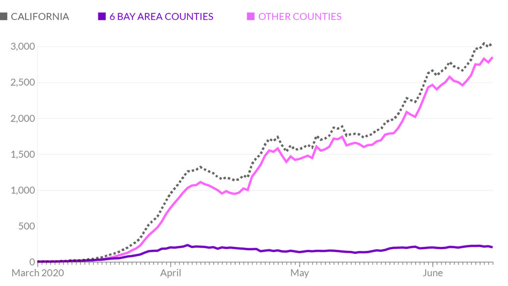Неверным было бы сказать, что из Демократических штатов болезнь переместилась в исключительно Республиканские. Например, довольно высокий рост в последние дни наблюдается и в Калифорнии. Однако, тут важно заметить, что болезнь распространяется в частях штата за пределами окрестностей Сан-Франциско, а вот вокруг него, количество заболевших держится на сравнительно низком уровне: