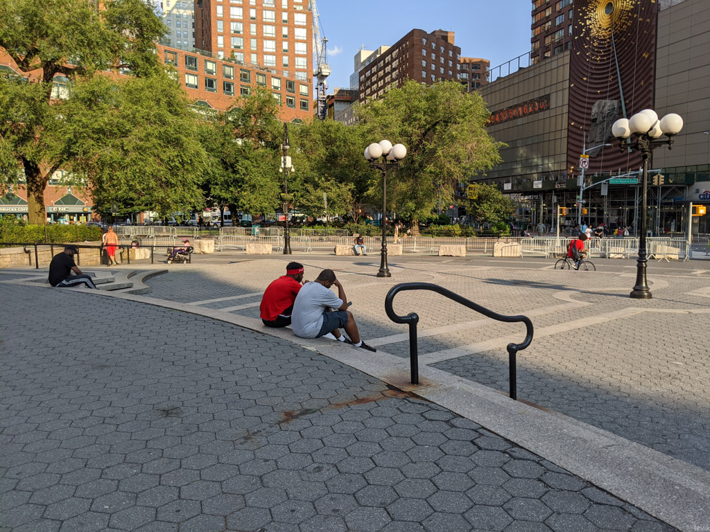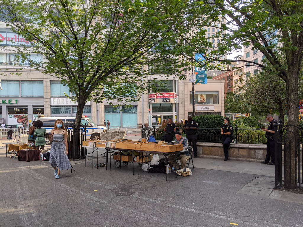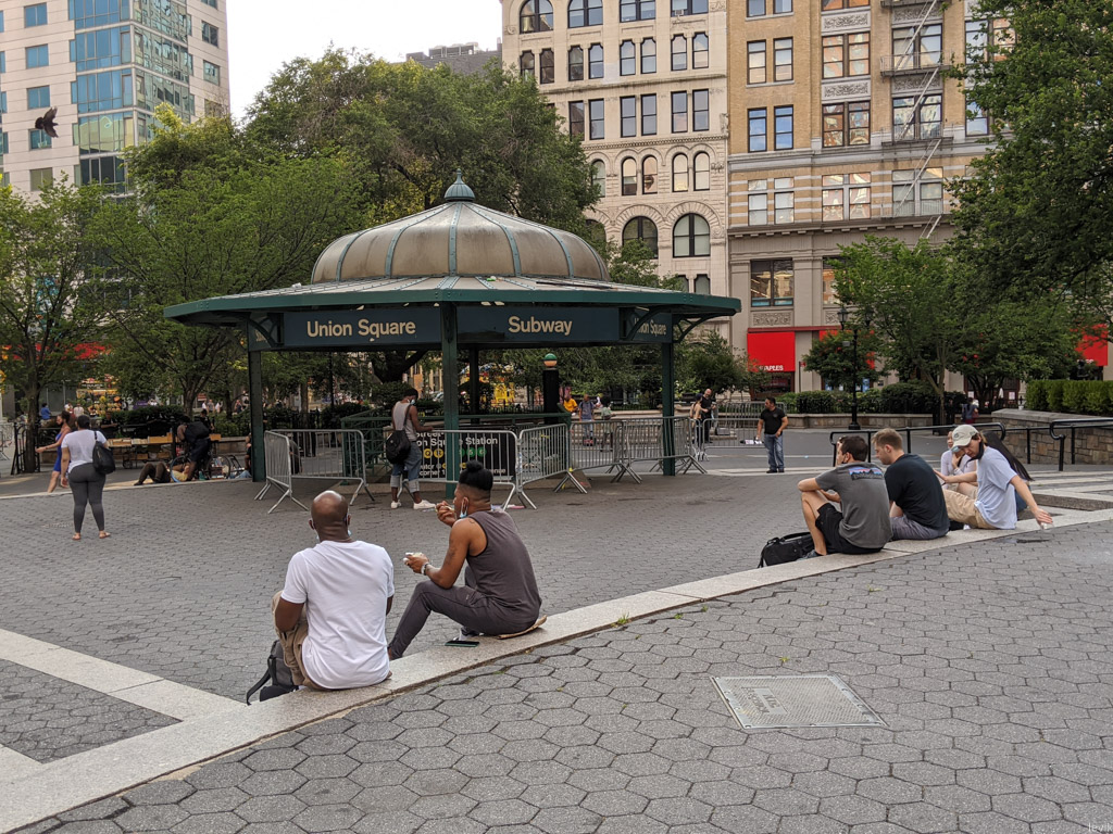 1. Приехали на Юнион Сквер. Было время, это была моя любимая из городских площадей. Она как бы "для своих", менее известна чем, скажем, Тайм-Сквер, и из-за этого тут всегда меньше туристов, и больше местных. Обычно здесь одновременно проходят какие-то ярмарки, акции протеста (жителям НЙ всегда есть о чём попротестовать!), уличная музыка и танцы, и много-много чего ещё. Но сейчас народу на площади заметно меньше обычного.
