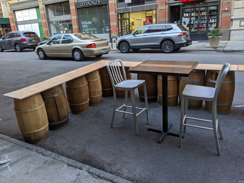 14. Уличный бар - с бочками в качестве ограды, и высокими столиками.