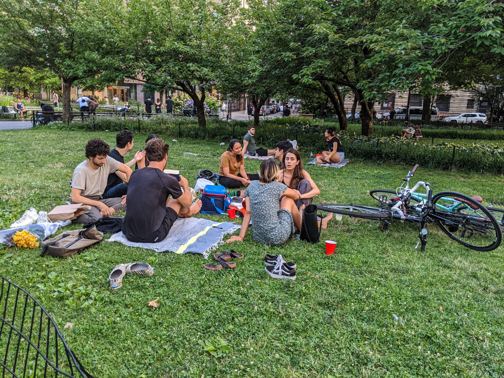 24. Рядом на газоне, соблюдая социальную дистанцию, группы людей наслаждались хорошей летней погодой.