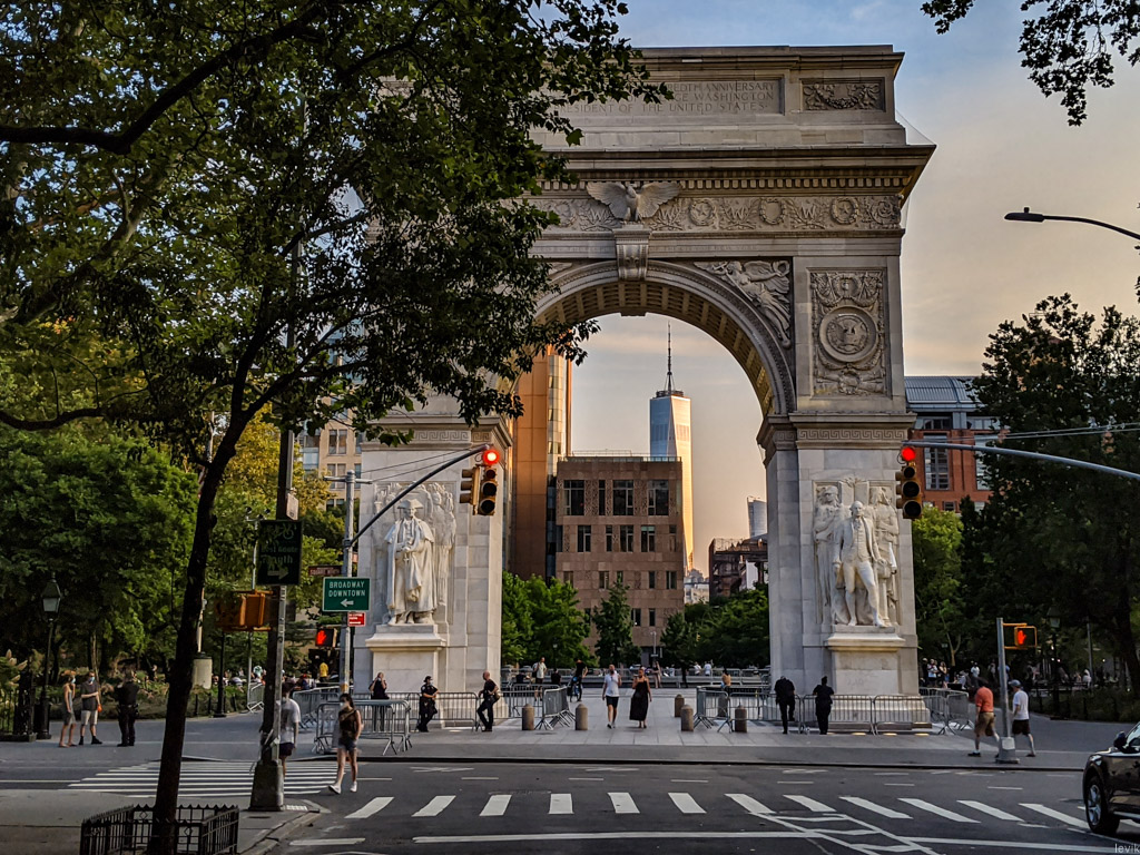 15. Подходим к другой площади - Вашингтон-Сквер. На входе стоит триумфальная арка, тоже посвящённая Джорджу Вашингтону. Вот её как раз неделю назад облили (вернее, закидали) красной краской какие-то отморозки. К нашему с Тоней приходу пару дней спустя, Вашингтона успели очистить, он выглядел как новенький.