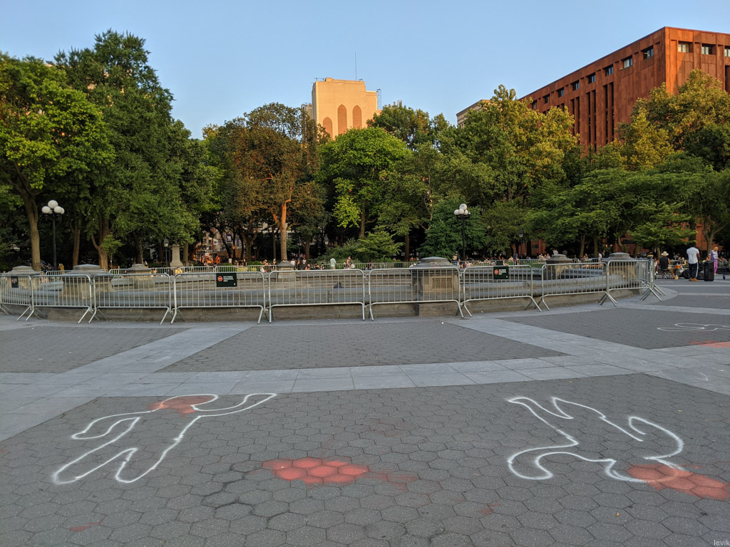 17. Фонтан в центре парка не работает, и отгорожен оградками. А на земле кто-то нарисовал силуэты человечков. В кино полицейские так обводят трупы. Наверное это какая-то акция против полицейского насилия. Сейчас все акции против него.
