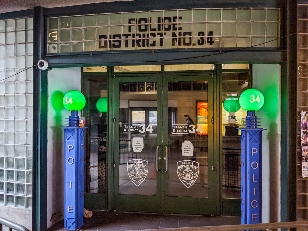 Каждый полицейский участок Нью Йорка выглядит по-своему, у NYPD отсутствует какой-либо единый архитектурный стиль. (Тут можно вспомнить японские участки-Кобаны, разбросанные по всей стране - они тоже все разные.) И зелёные фонари перед каждым отделением непохожи друг на друга. Например, здесь снова сферы, но с номером участка (34) прямо на них.