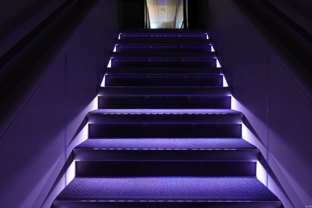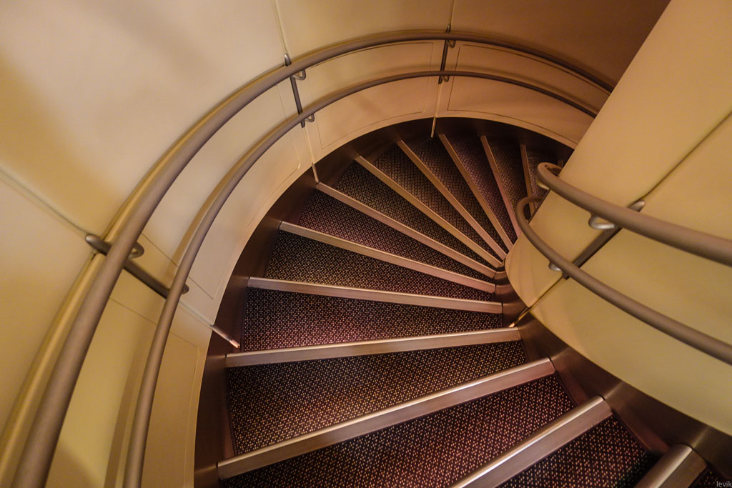 45. В хвосте самолёта красивая винтовая лестница вниз - пожалуй самая великолепная "фишка" интерьера А380.