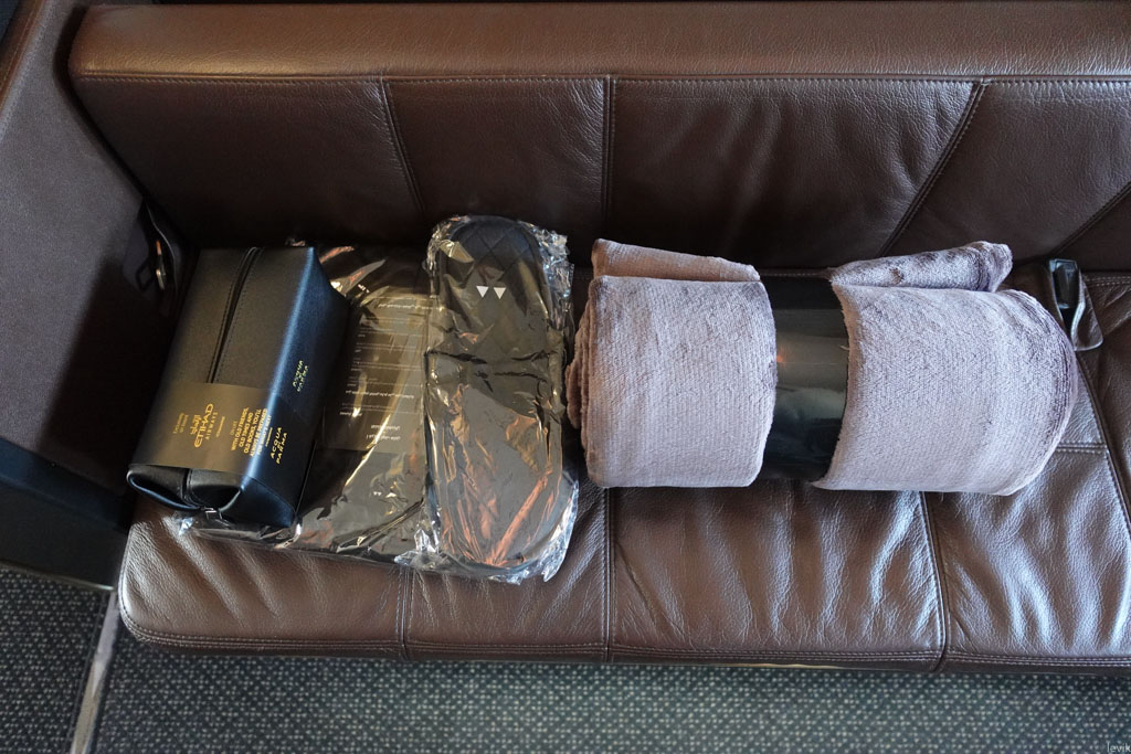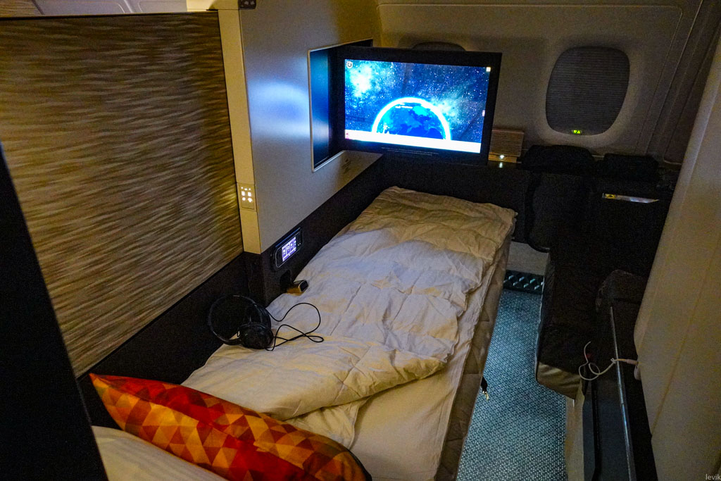 14. На кушетке меня ждут всякие полезности от авиалинии. Дорожный набор, тапочки, пижама, и плед, чтоб укутываться если станет зябко до того, как мне подадут полноценную постель.