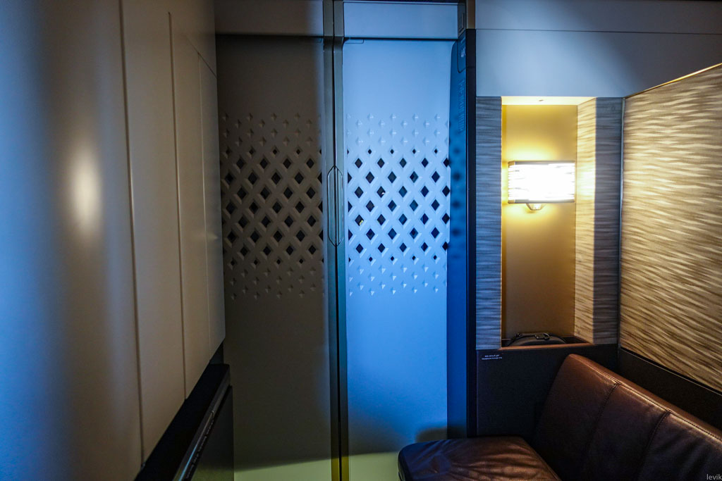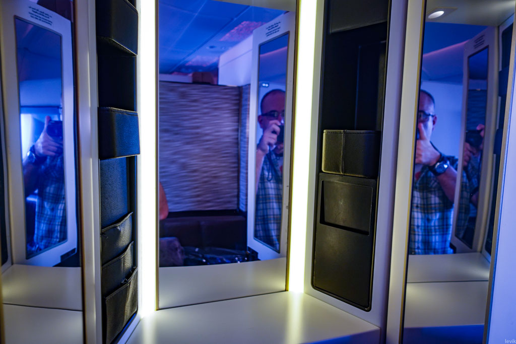 53. Сама душевая кабинка не представляет собой ничего особенного (слышал что у Emirates они гораздо круче выглядят)... Она не слишком то и большая и на особо красивая. Вся её ценность и уникальность заключается в том, что она находится на борту авиалайнера. Члены экипажа тщательно моют душевую после каждого пассажира, так что элемент "общей" душевой здесь фигурирует не больше, чем в обычных отелях.