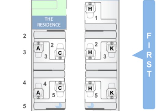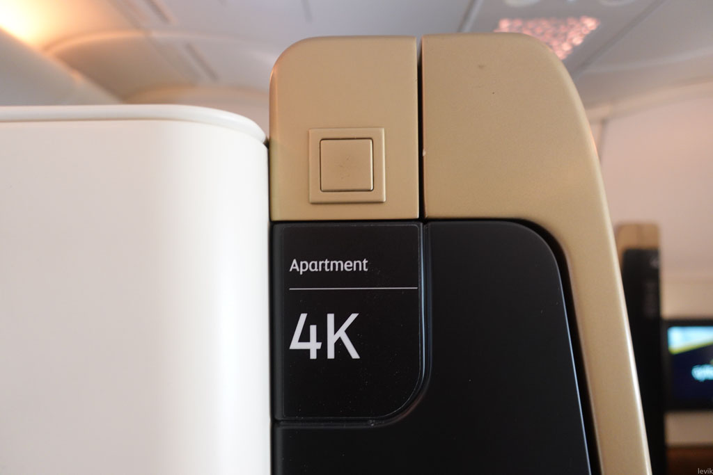 Из девяти первоклассных Апартаментов, пять устроены таким образом, что кресло направлено назад. Признаюсь, я никогда так не летал, но почему-то мне кажется, что это не так удобно. Значит мы отметаем ряды 1, 3 и 5. Из оставшихся рядов второй явно хуже, так как в нём сидения находятся ближе к коридору, а хотелось бы сидеть у окна. Это значит остаётся четвёртый ряд. Но как выбрать между местами А и K? Тут надо знать конкретный маршрут рейса. Я посмотрел несколько предыдущих полётов и выбрал правую сторону, то есть вот моё место: Апартамент 4К.