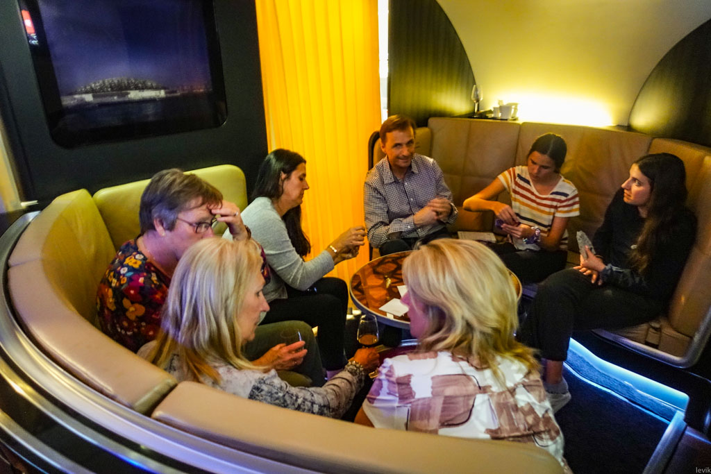 40. Ладно, пришло время сделать кружок по самолёту. На борту А380 есть две лестницы, но часто вас не пустят на обе если вы не купили правильный билет. К счастью, для пассажиров первого класса открыты почти все двери. Начнём с верхнего яруса. Прямо за первым классом находится большая кухня, а дальше за ней - бизнес-бар. Я не раз встречал, что авиалинии устраивают на своих самолётах нечто подобное для пассажиров бизнес-класса, но, если честно, то здесь на борту я впервые увидел, что этот бар пользуется спросом.