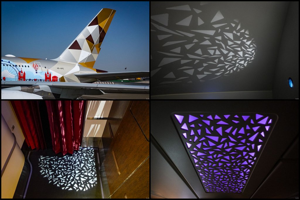 48. По всему самолёту заметны продуманные штришки дизайна. Например, фирменный стиль компании Etihad - с узором из треугольников, обыгрывается на некоторых поверхностях с помощью световой проекции: