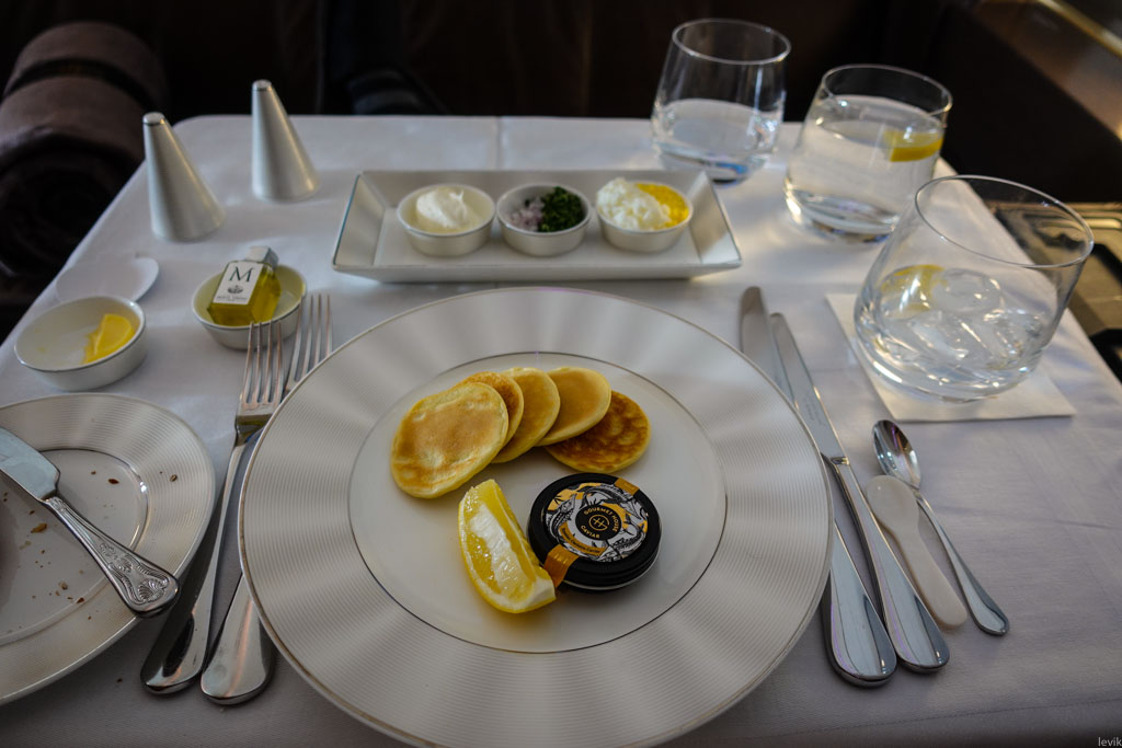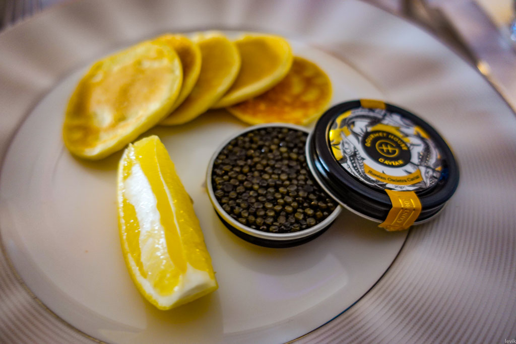 34. Затем принесли чёрную икру (русскую осетровую), с мини-оладушками и стопариком водки.