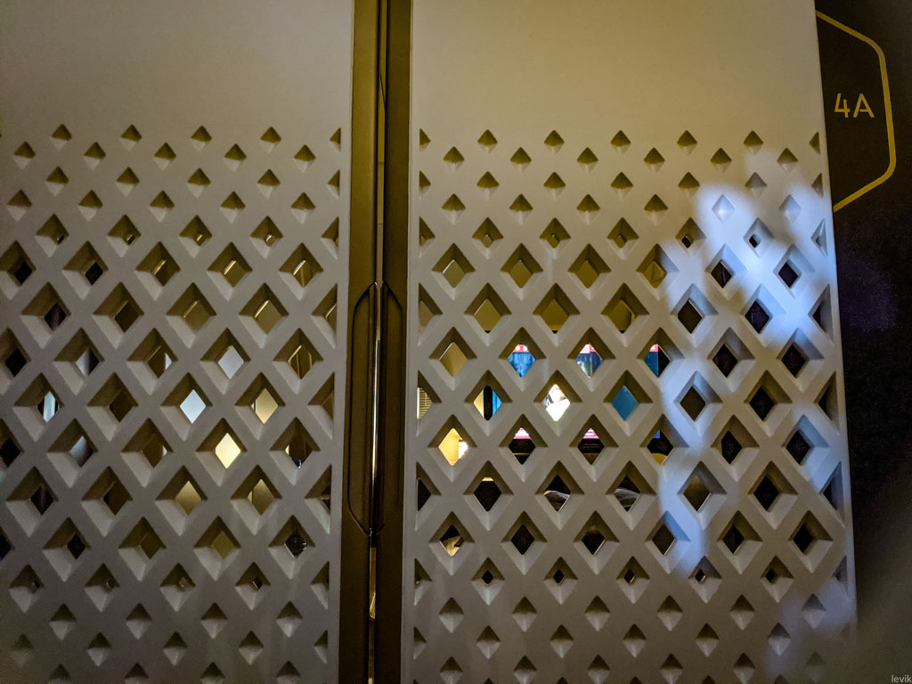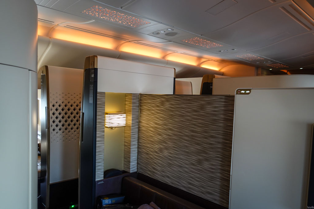 Большинство перегородок заканчиваются где-то на высоте человеческого роста, и этого в принципе достаточно для того, чтоб создать приватное пространство. Но стенка между соседними отсеками доходит только до уровня плеч, и стоя на пороге своих Апартаментов мне было видно соседа из 3К, сидящего лицом в сторону хвоста самолёта.