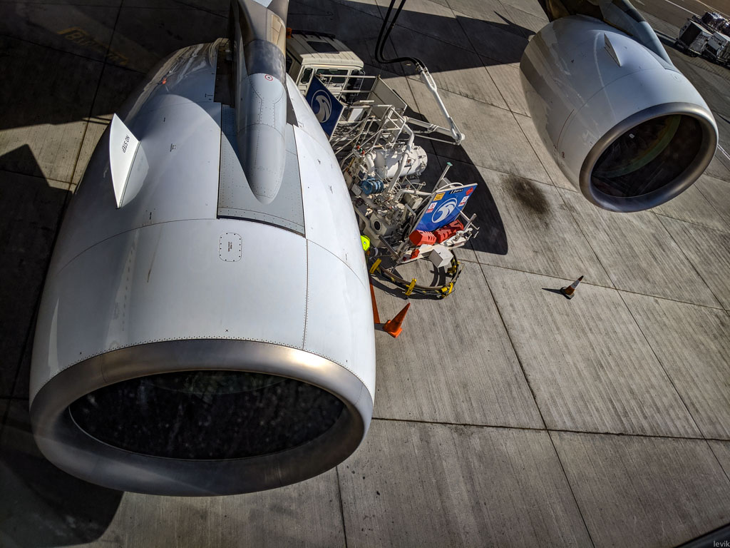 Первый пизнак того, что я выбрал верное место: если изловчиться, то можно сфотографировать через окно вид с двумя двигателями. Снять такой ракурс на А380 можно только со второго этажа, из носовой части самолёта.