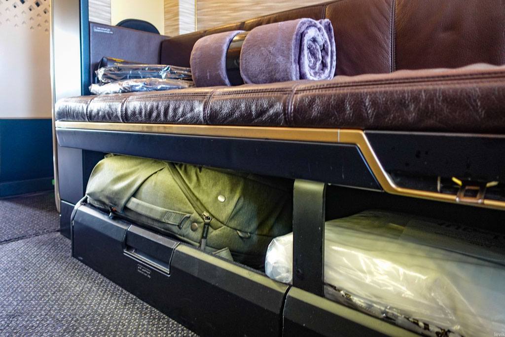 15. А под кушеткой находится небольшой багажный отсек. В салоне первого класса нет багажных полок над головами - подразумевается, что мало кто из богатых пассажиров притащит с собой в салон большие чемоданы. Но я не типичный пассажир этих Апартаментов, и всё своё привык возить с собой. К счастью мой дорожный рюкзак в аккурат помещается в отведённое место.
