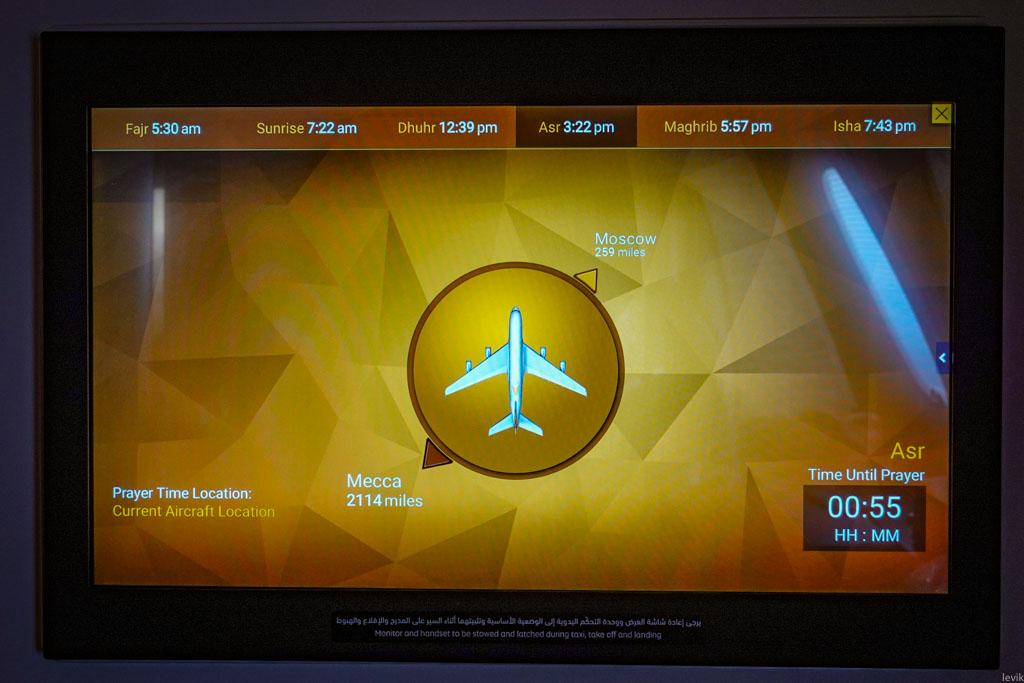 50. Карта показала, что мы пролетаем совсем недалеко от Москвы. Я, как коренной москвич, тут же обрадовался. А потом заметил, что в углу обозначено время следующей молитвы для мусульман. А наверху экрана - все пять ежедневных молитв.