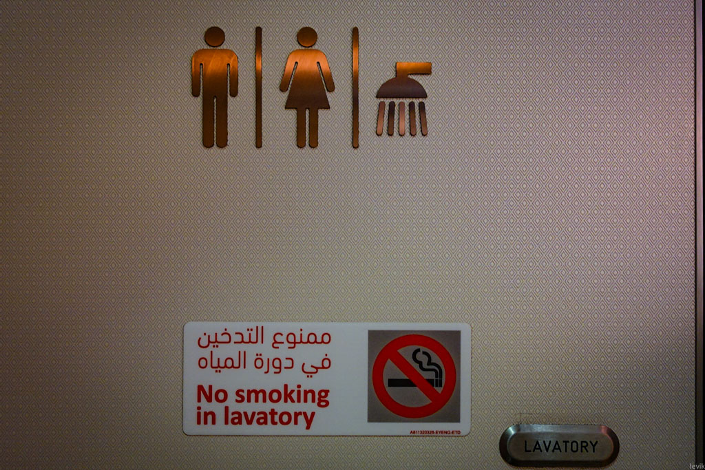 52. Заметили лишнюю пиктограмму? Помимо туалета тут ещё и душевая. Всего на первый класс два туалета: один абсолютно заурядный, а другой - с душевой. Насколько я знаю в мире есть только две авиалинии, которые предоставляют своим пассажирам возможность принять душ высоко над землёй. Помимо Etihad есть ещё Emirates - обе базируются в Объединённых Арабских Эмиратах.