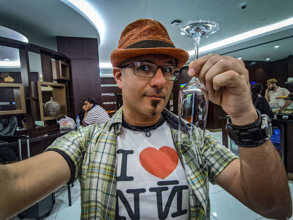 4. Попросил и выпил бокальчик шампанского, и сделал последнюю (до сих пор) селфи на территории иностранного государства. Как видите, на мне традиционная футболка возвращения домой.