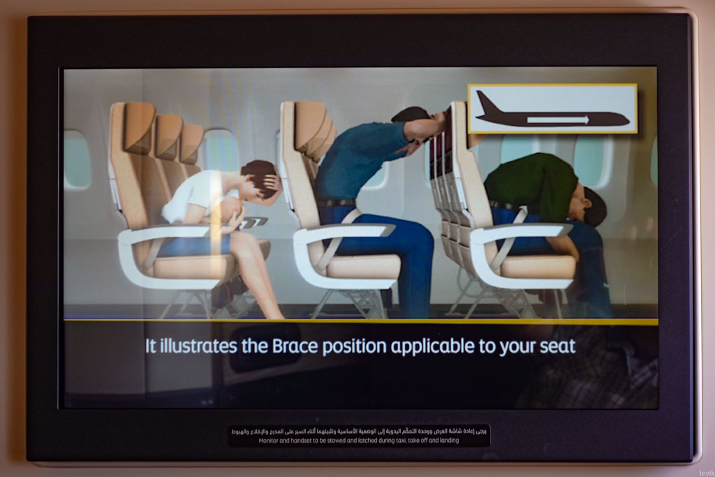 20. Но сейчас ничего контролировать нельзя, потому что запустили обязательный ролик про авиа-безопасность. У некоторых авиалиний эта презентация включает в себя иллюстрацию того, как надо сгруппироваться если самолёт вдруг потерпит аварию. Авиалинии в Америке такого не показывают, интересно, почему?