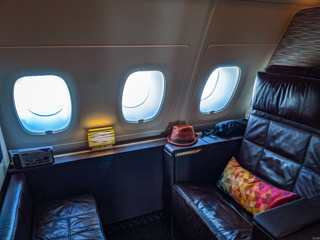 44. Весь остаток верхнего яруса - сидения бизнес-класса. Вот так выглядит бизнес-кресло на этом рейсе. Они тоже чередуются между рядами - некоторые ближе к окну, другие, как это - к проходу.