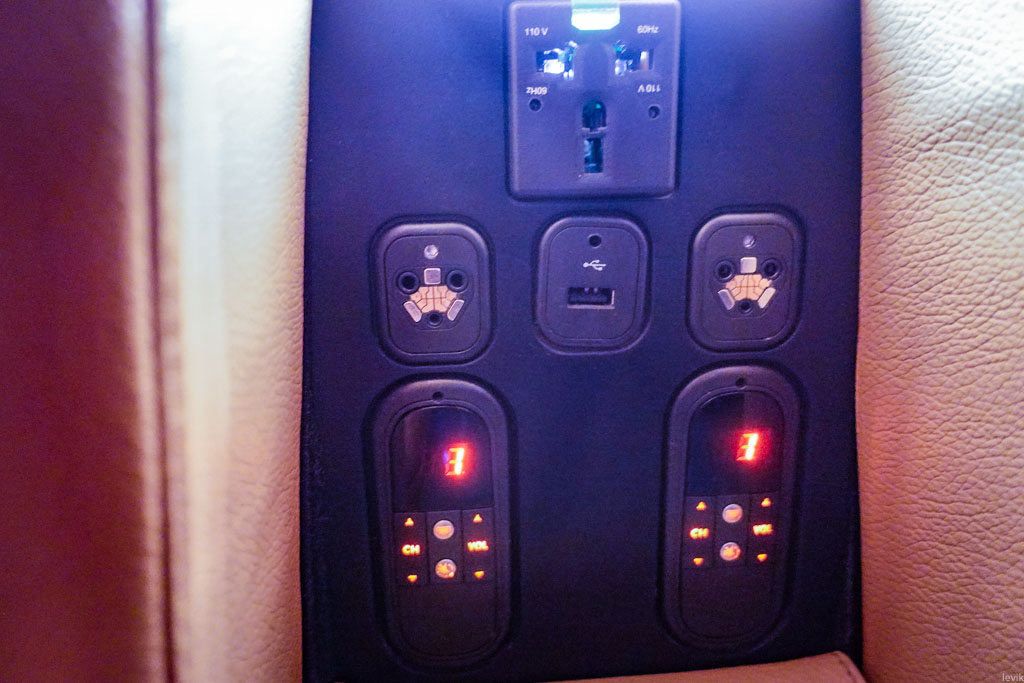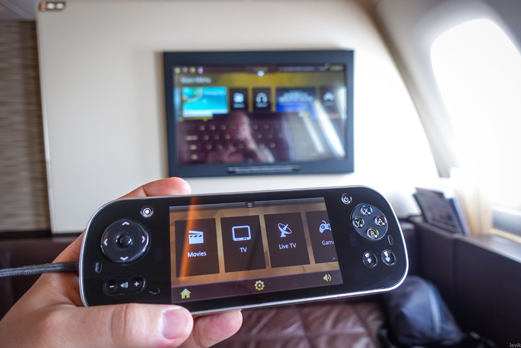 19. На перегородке впереди висит большой телеэкран. Так как до него аж целых три иллюминатора, дотянуться невозможно, поэтому я так и не узнал сенсорный или нет. Зато прямо в подлокотнике вмонтирован небольшой видеопульт, для управления различными функциями системы развлечений.