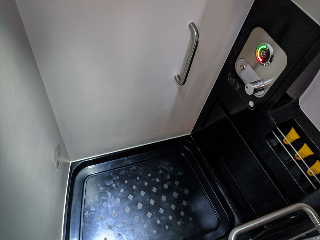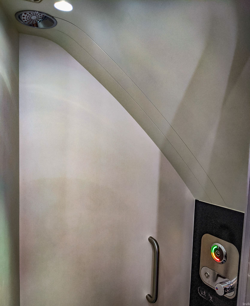 54. Душ вмонтирован в углу этой кабинки. Его позиция зафиксирована, так что направлять поток воды куда хочешь не получится. В кабинке есть ручка за которую можно схватиться в случае тряски. Не удивлюсь, если где-то в этой уборной есть и ремни безопасности, и кислородные маски с потолка!
