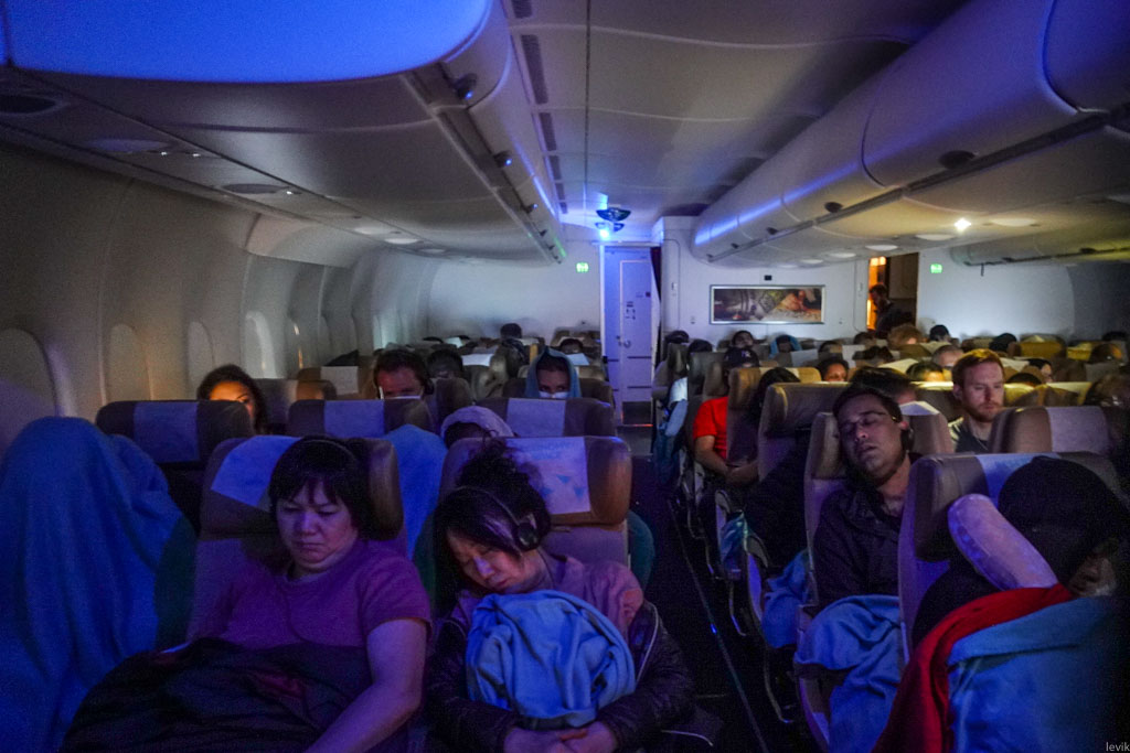 46. А весь нижний этаж занят эконом-классом, который на нашем рейсе был забит под завязку. В темноте было сложно разглядеть, насколько комфортны эти сидения.