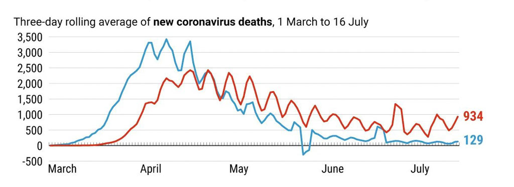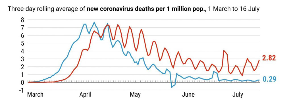 Да, мы к счастью не наблюдаем полный возврат к апрельским уровням смертности (когда некоторые дни уносили почти столько же американских жизней, как теракт 9/11). Скорее всего это из-за того, что Covid-19 сейчас попал в более молодое и здоровое население. Однако на этом графике отлично виден небольшой рост смертности в июле, который предсказуемо последовал за сильным ростом заражения в июне.
