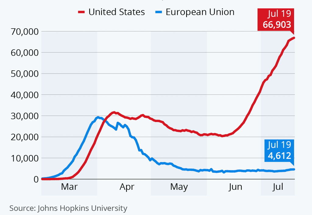 Сперва давайте взглянем на обновлённую статистику по заражениям Covid-19 - сравнивая Европу и США. Когда я несколько месяцев назад критиковал невнятные действия администрации Трампа по борьбе с вирусом, мне многие отвечали: "А покажи нам страну, где с коронавирусом справились лучше!" Тогда я мог привести в пример Южную Корею или Новую Зеландию, но они уж слишком далеки и непохожи на нас. Но сегодня можно смело сказать: Европа в целом справилась с этим вирусом лучше, чем Америка, несмотря на очень страшную статистику на раннем этапе. Они сумели взять этот вирус под контроль, а мы нет: