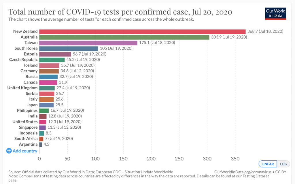 И тут обычно в ход пускают первый аргумент: да, в США больше выявленных случаев, потому что здесь делают больше анализов. Но это лишь отчасти правда. Вот график, показывающий, сколько анализов делают в разных странах, чтоб выявить одного заражённого: