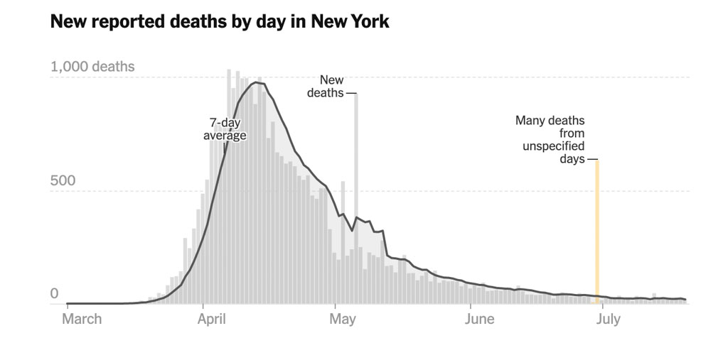 А вот для сравнения, что происходит у нас в штате Нью Йорк, где пик болезни пришёлся на апрель. Несмотря на очень активные протесты (и даже беспорядки, заставившие власти ввести комендантский час!) никакого роста коронавируса (и смертей от него) здесь нет: