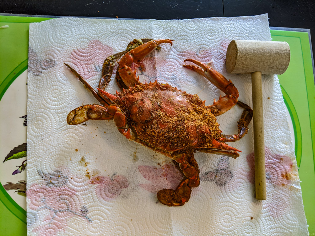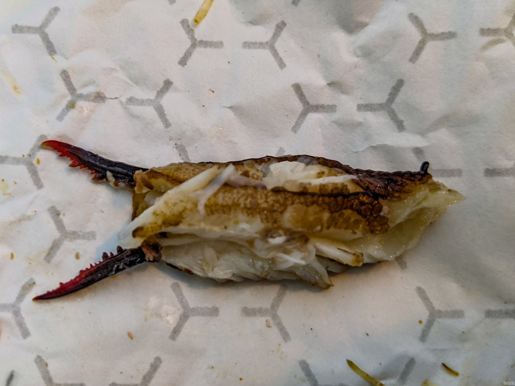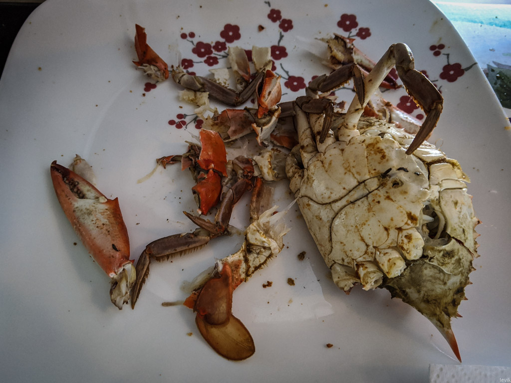 29. Проблема в том, что с этими крабами огромное количество возни, ради сравнительно небольшого количества мяса. В итоге у тебя все руки жирные, а на тарелке перед тобой огромная груда осколков от панциря. Мне наверное, одного раза хватило. Опыт был прикольным, и я не жалею о нём, но опять так возиться с едой я не готов.